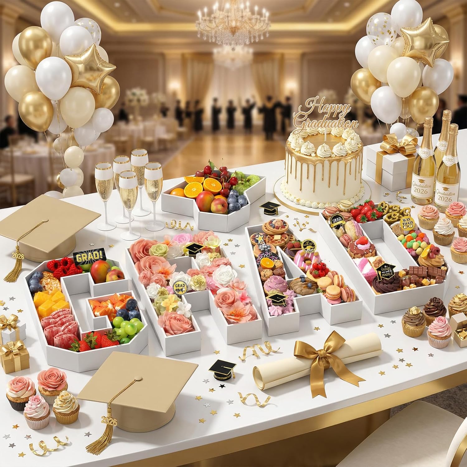 Size information Each letter measures approximately 13.78 inches in height, 7.87 inches in width, and 2 inches in depth, while the graduation cap tray measures approximately 10.63 ร 5.91 inches. ๐ The graduation letter cardboard set forms the word โGRADโ with a graduation cap, creating a celebratory centerpiece for graduation parties, milestone birthdays, or school send-offs. Decorative function โจ This white GRAD charcuterie board set adds a stylish and playful touch to your graduation celebrations. ๐ฐ Fill each tray with cupcakes, cookies, candies, chocolates, fruits, or small graduation-themed gifts. ๐ธ Create a photo-ready graduation charcuterie display or dessert table that is visually appealing and personalized. Features ๐ฆ Made from thick foam cardboard and food-grade materials, providing a stable base for arranging snacks. ๐จ The generous depth of each tray and the 5-piece graduation letter set allows versatile decoration. ๐ฌ Easily design a customized centerpiece that can hold sweets, desserts, fruits, or small gifts for your graduation party. Applicable scenarios Ideal for: ๐ Graduation parties ๐ Class of 2026 celebrations ๐ซ School or college send-offs ๐ช Dessert tables ๐ธ Photo backdrops ๐จโ๐ฉโ๐งโ๐ฆ Family gatherings ๐ Milestone birthdays The white GRAD charcuterie board with graduation cap adds a festive, creative, and memorable touch, turning any table into a charming celebration display.